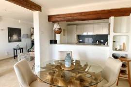 In einer kleinen Wohnanlage, in exponierter Lage, befindet sich diese aufwendig renovierte Wohnung in Cala Fornells. Die Wohnfläche verteilt sich über ein großes Wohnzimmer mit Kamin und Essbereich, Leseecke, eine hochwertige offene Einbauküche, sowie zwei Schlafzimmer (eines davon innenliegend, kühl in den Sommermonaten) mit zwei Bädern en Suite. Des Weiteren gibt es ein weiteres kleines Zimmer, das als Büro oder Einzelschlafzimmer nutzbar ist. Vor ein paar Jahren wurde das Apartment hochwertig renoviert und sehr geschmackvoll möbliert. Die südorientierte Terrasse bietet traumhafte Aussichten über mehrere Buchten, das offene Meer und die Malgratsinseln. Eine Garage kann optional für 50.000,-€ dazu erworben werden.